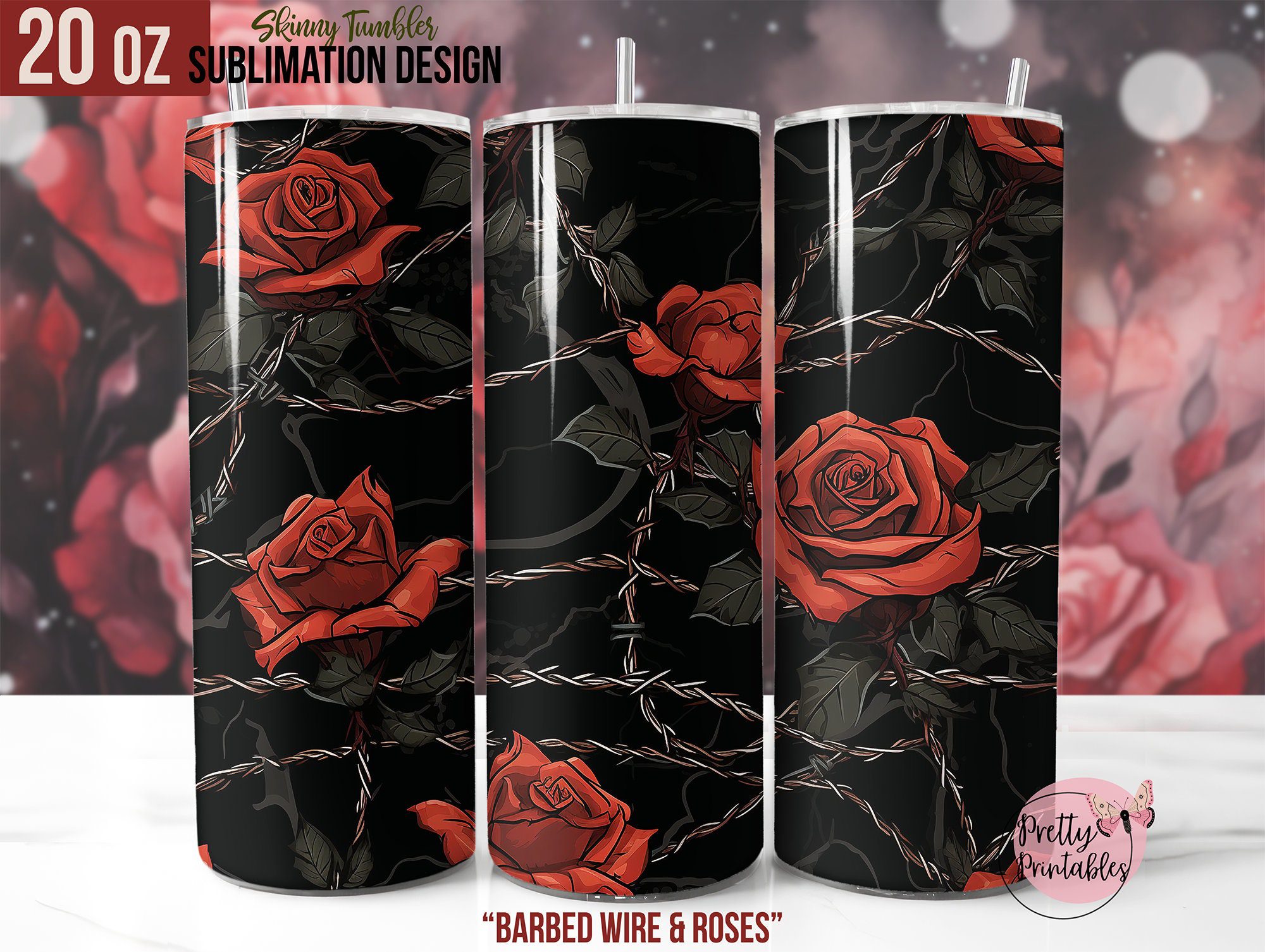 The Barbed Wire & Red Roses Tumbler Wrap is a seamless design that masterfully blends the dark allure of barbed wire with the romantic beauty of red roses.