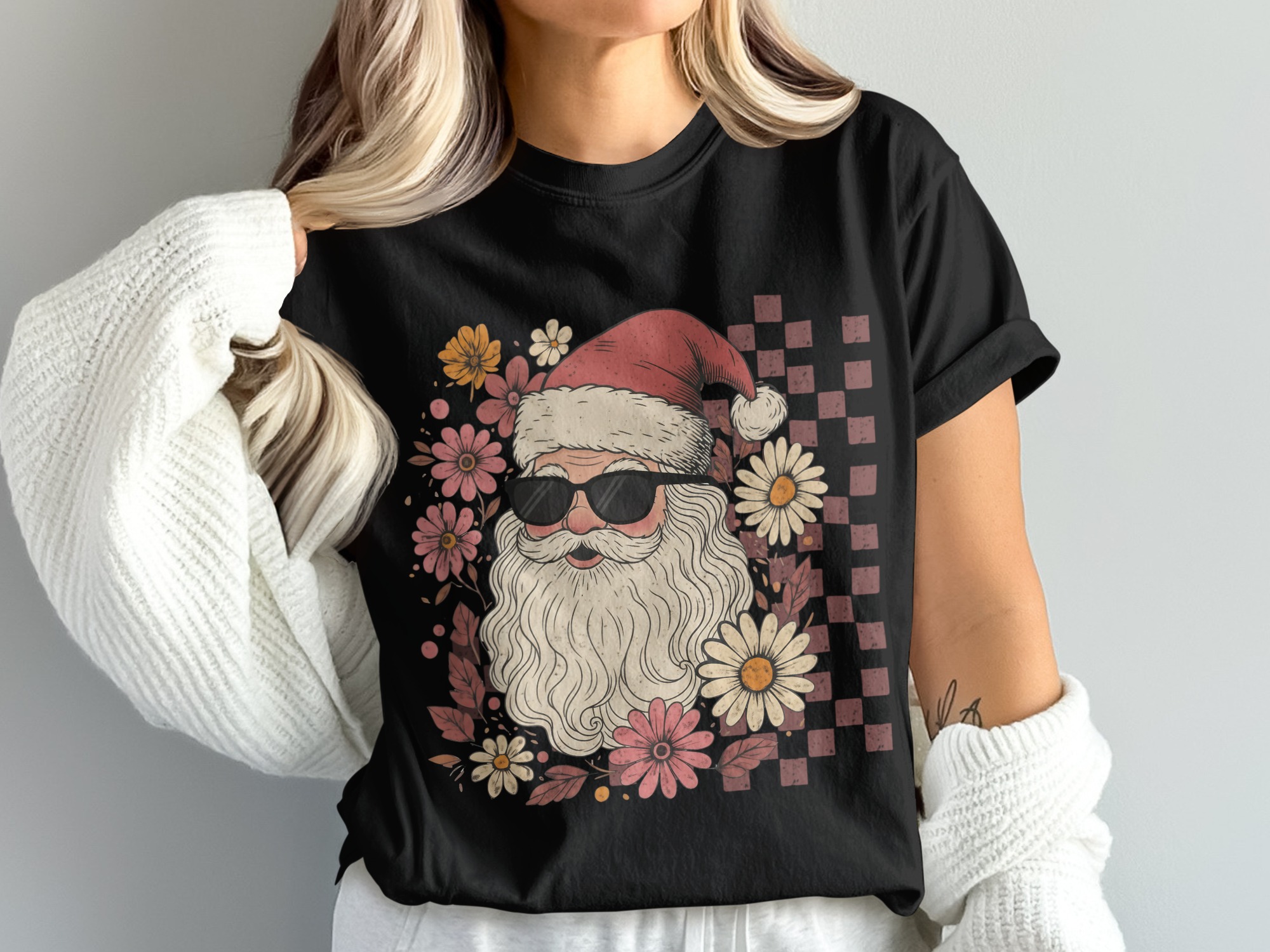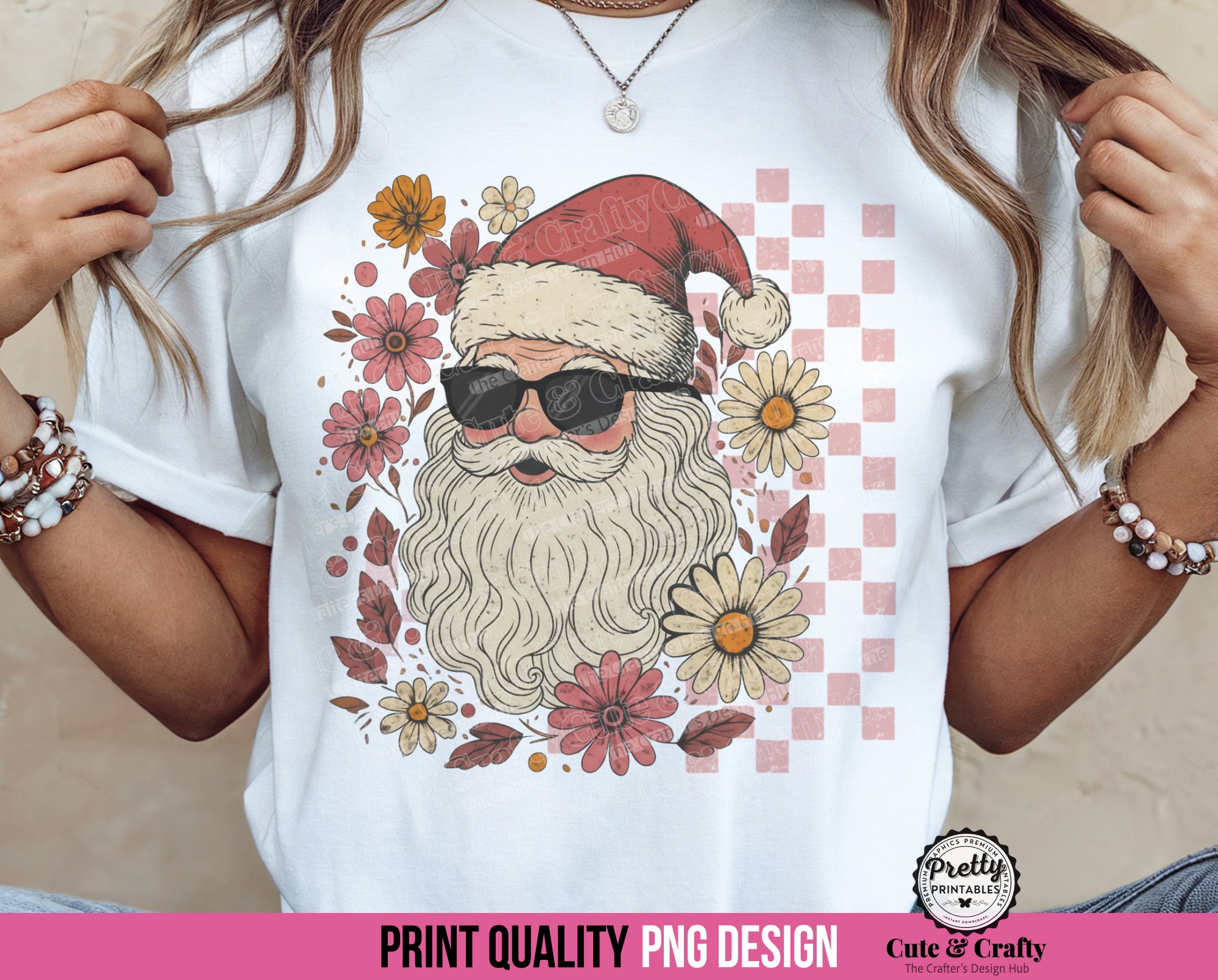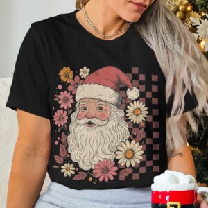 This Boho Pink Santa PNG Sublimation Design features a vintage-inspired Santa surrounded by delicate boho florals in soft pinks and warm tones, and a distressed pink checkered pattern in the background.