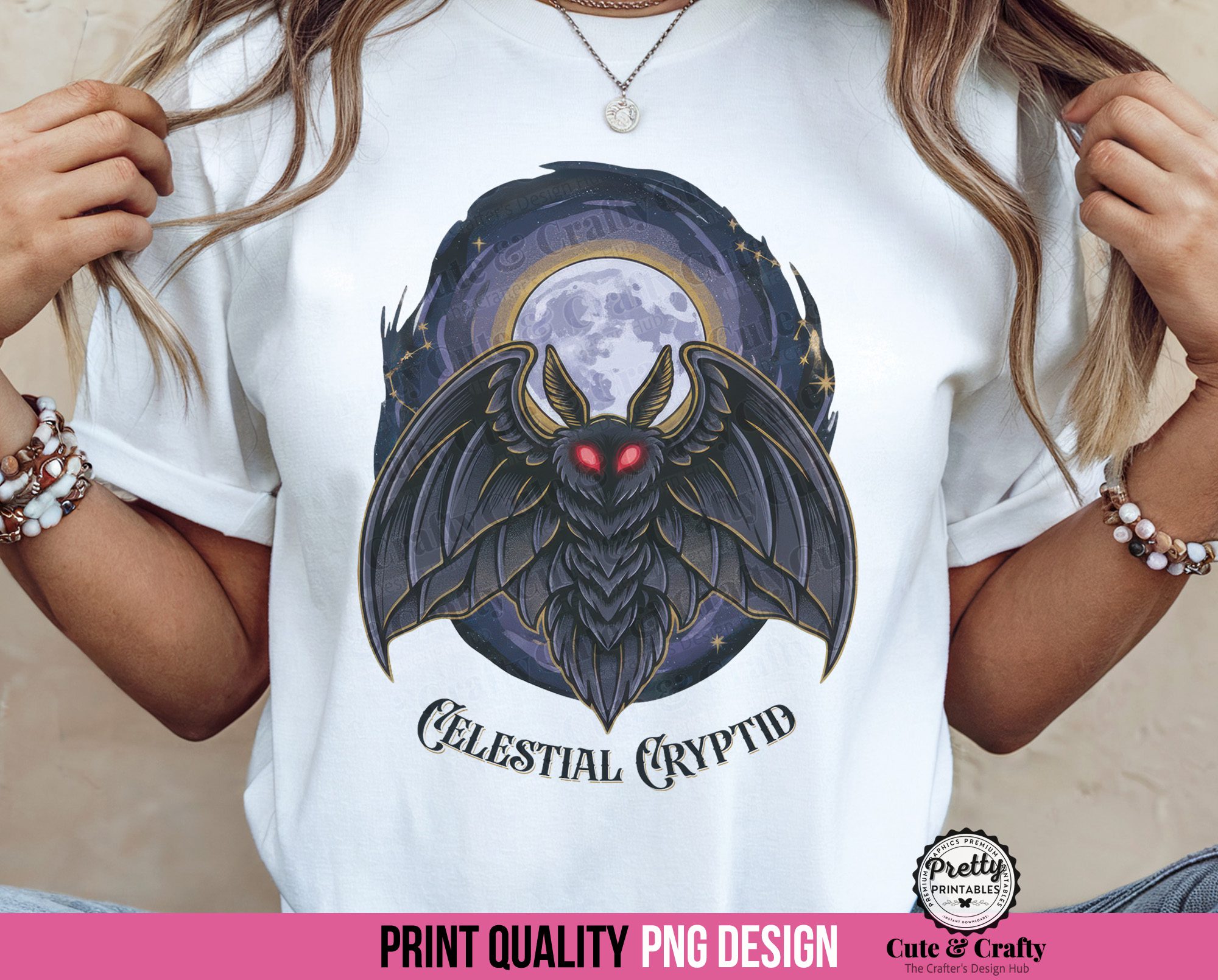 This Celestial Cryptid Mothman Shirt PNG is an absolute must-have for anyone who loves spooky folklore and cosmic vibes.