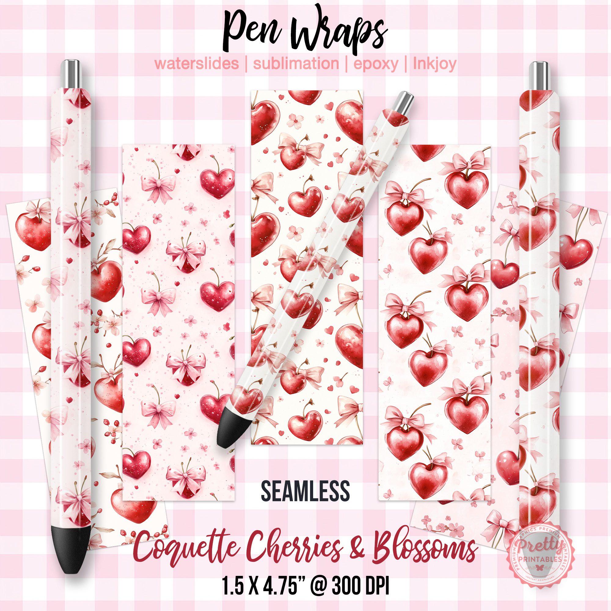 Add a sprinkle of sweetness to your pens with these Coquette, Heart Cherry, and Sakura Pen Wraps! Featuring adorable cherries, delicate bows, and a soft, feminine aesthetic, this sublimation pen wrap bundle is perfect for soft girl vibes and anyone who loves a touch of playful elegance.