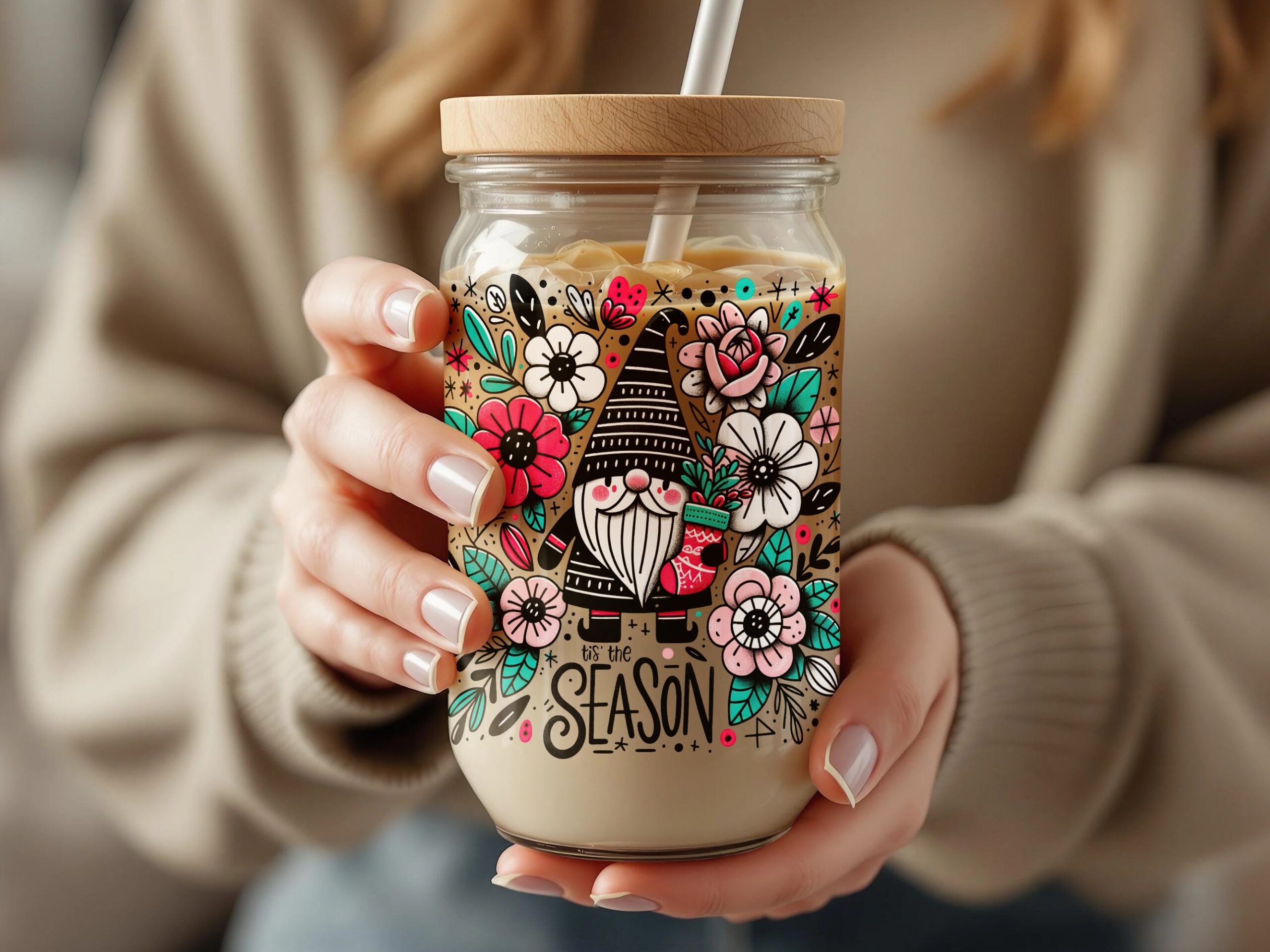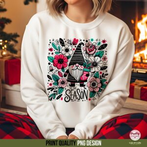 Featuring a darling, striped-hat Scandinavian gnome nestled amongst gorgeous pink and red flowers, berries, and snow accents, this Christmas girly sublimation design instantly brightens up any project. Imagine this vibrant design on a cozy winter gnome sweatshirt or used for unique Christmas cards and mugs.