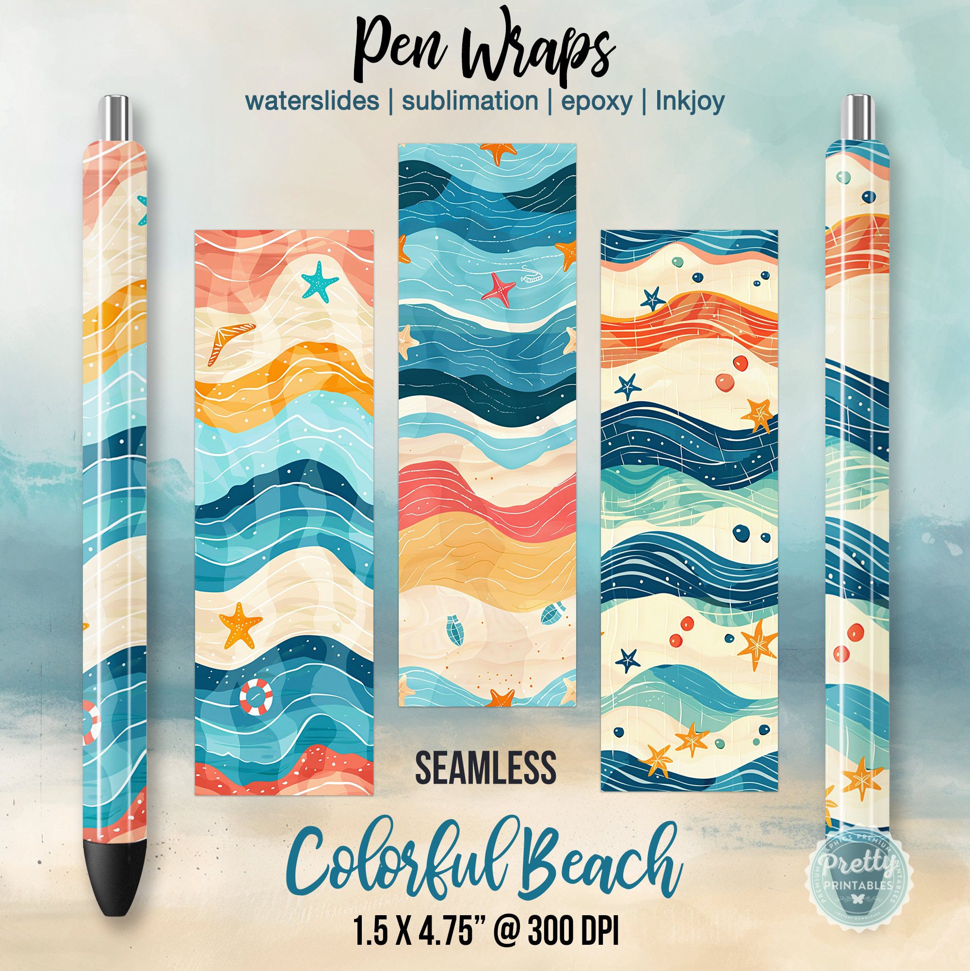 This colorful beach-themed pen wrap bundle features a lively beach-themed design, perfect for bringing the tropical summer vibe to your custom pens.