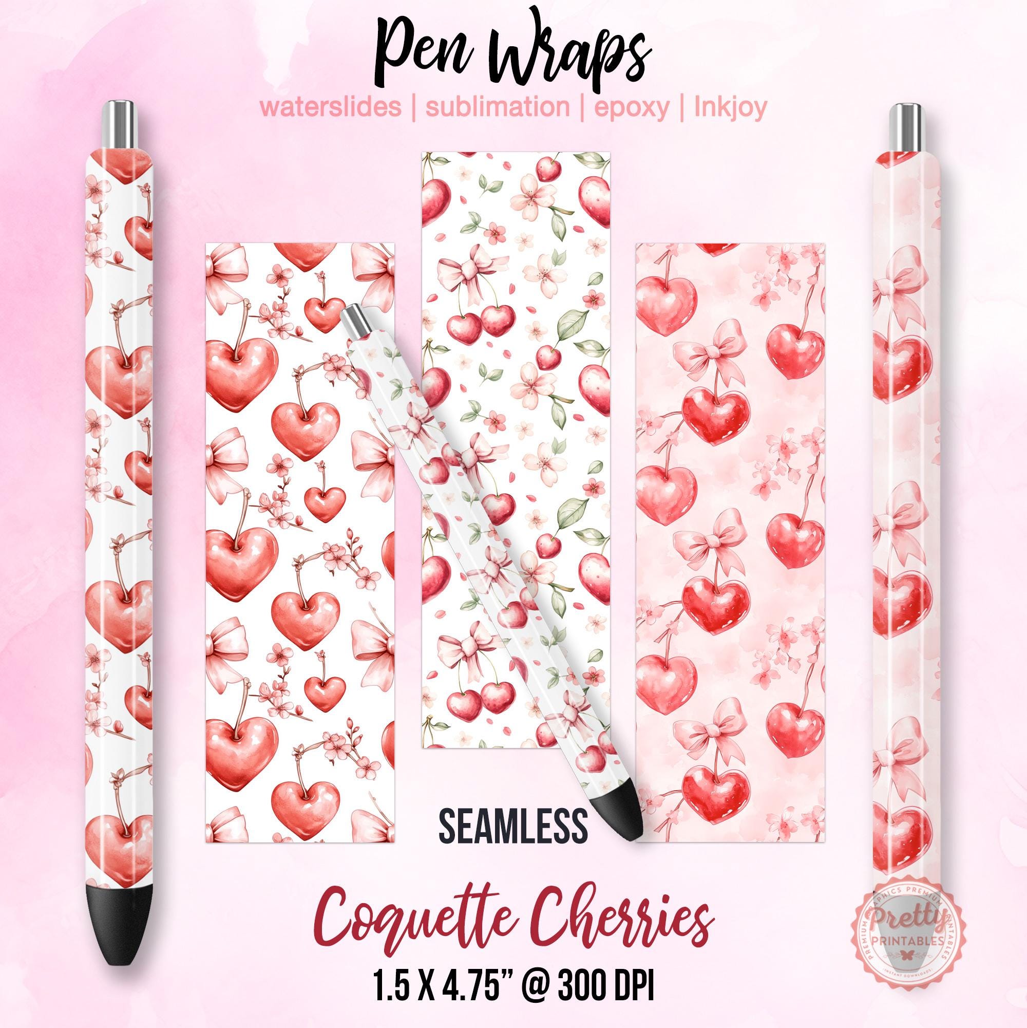 Bring a touch of elegance and whimsy to your pens with these Coquette Cherry Pen Wraps! Featuring a delightful mix of cherries, sakura blossoms, and dainty bows, this sublimation pen wrap bundle is perfect for soft girl aesthetics and anyone who loves a blend of sweetness and sophistication.