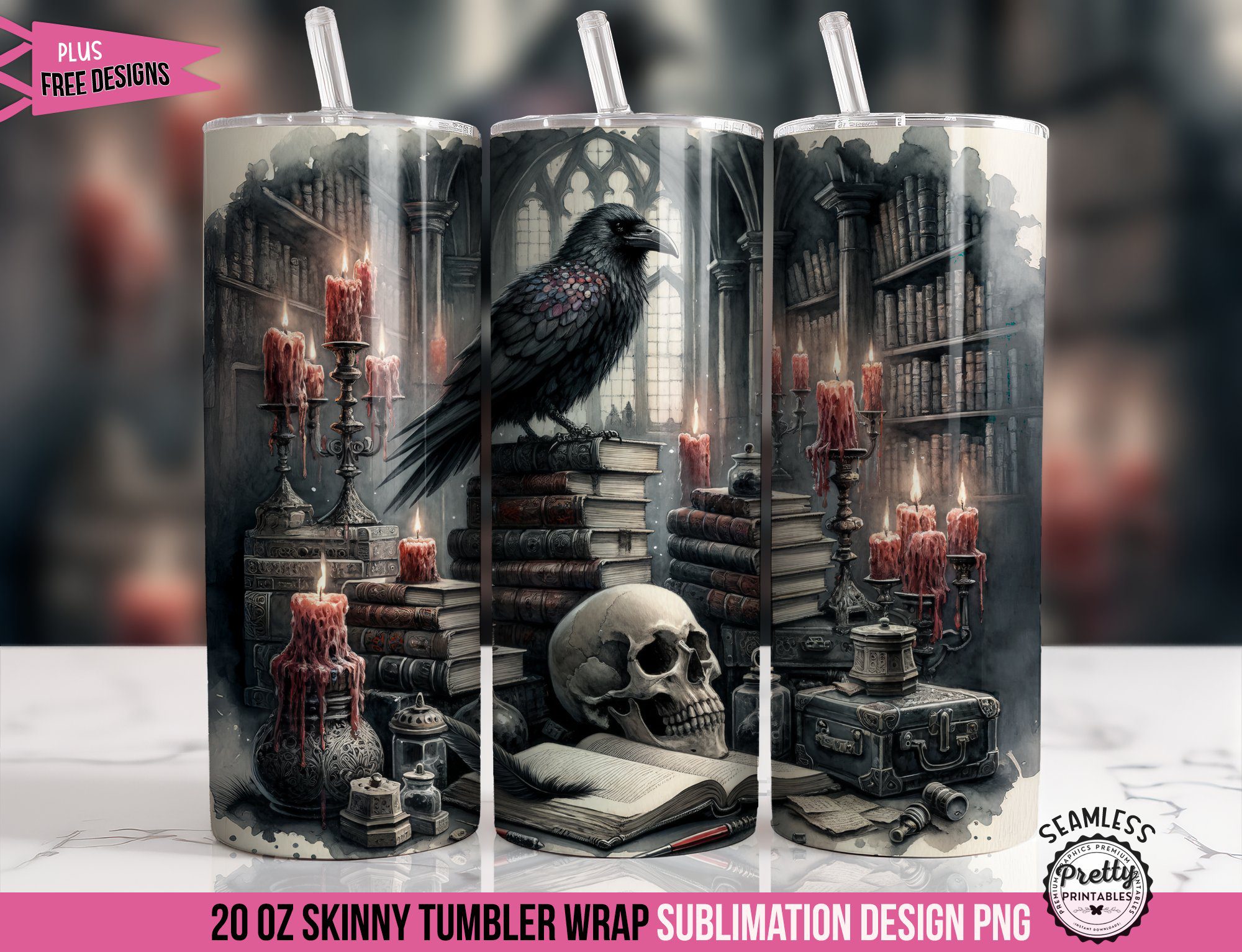 Featuring a hauntingly beautiful scene of stacked books, flickering candles, a raven, and a skeleton motif, this design is dripping with gothic elegance. Whether you’re sipping coffee while reading your favorite classic or adding a touch of mystery to your daily routine, this tumbler wrap is the perfect way to showcase your love for all things dark and bookish. Download it today and bring a little gothic magic to your tumbler collection!