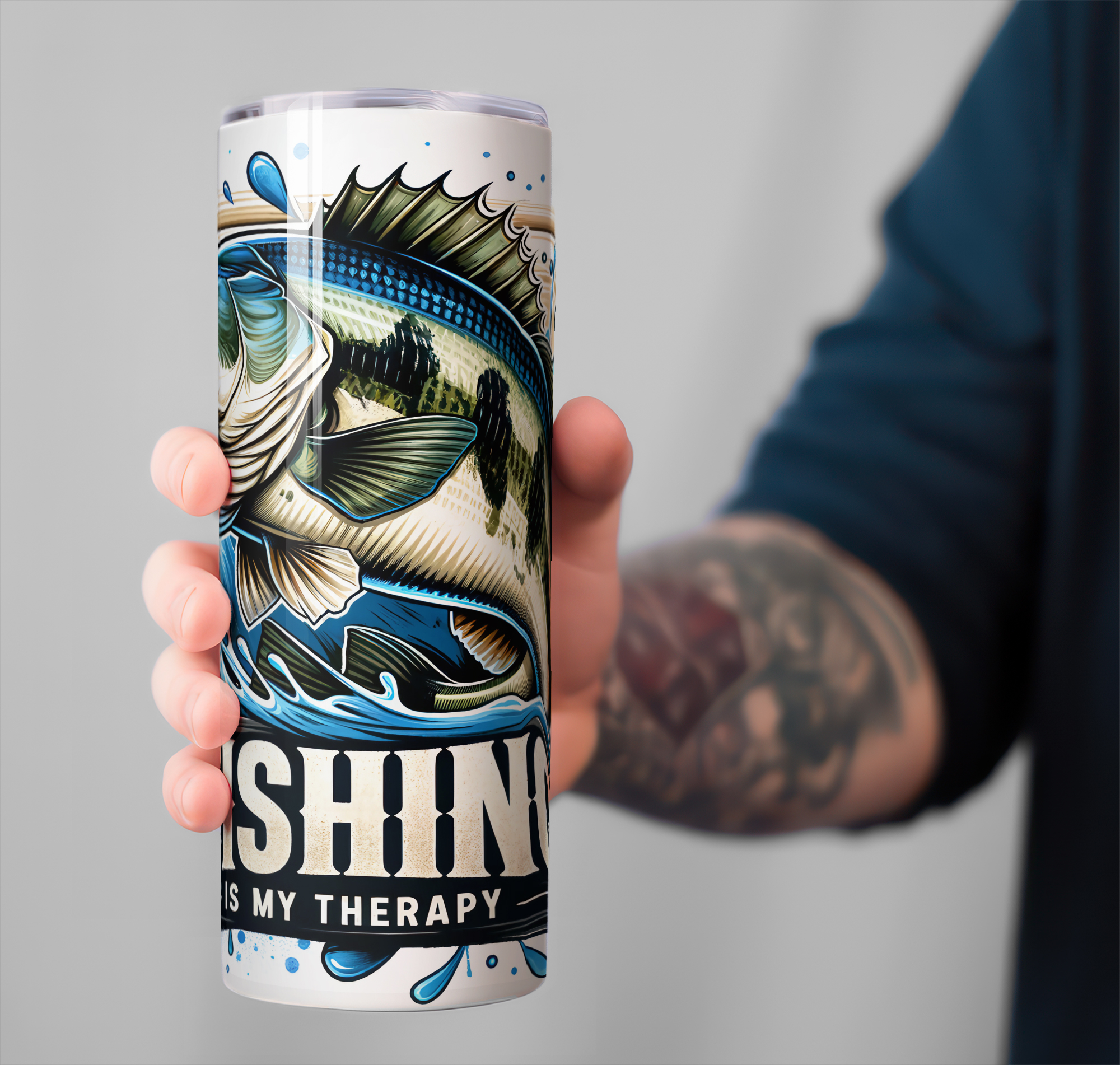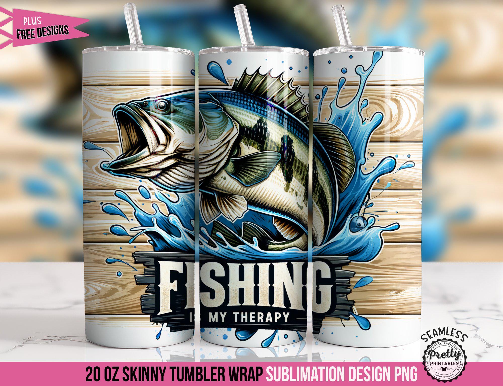 Featuring a dynamic bass design with explosive water splashes against a rustic wood backdrop, this wrap turns your 20oz tumbler into a statement piece that screams “gone fishing.” The striking blue water effects and detailed bass illustration pop with energy, while the “Fishing Is My Therapy” message speaks to every angler who finds peace on the water.