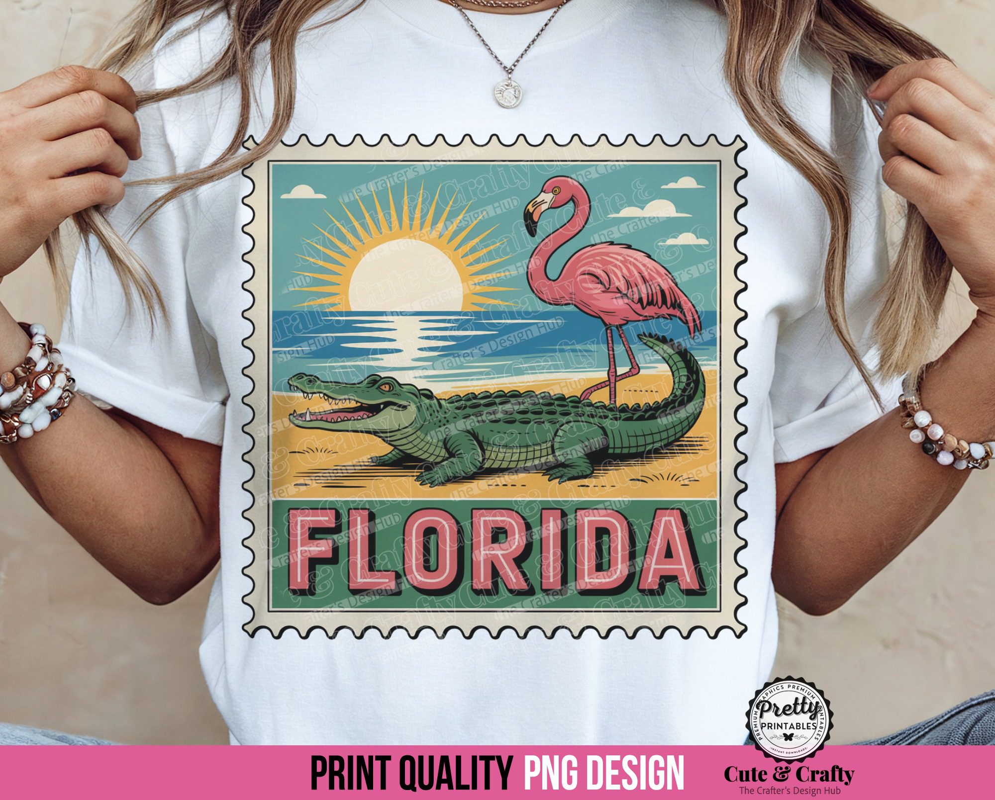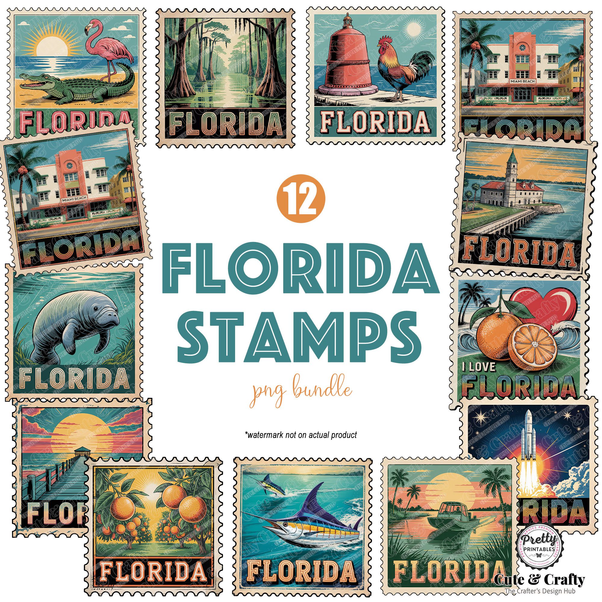 Packed with 12 beautifully detailed Florida stamp designs from iconic flamingos and alligators to Miami’s colorful art deco buildings and serene beach sunsets, this collection brings classic Florida vibes to your creative projects. Great for junk journaling, sublimation, paper crafts, and POD.