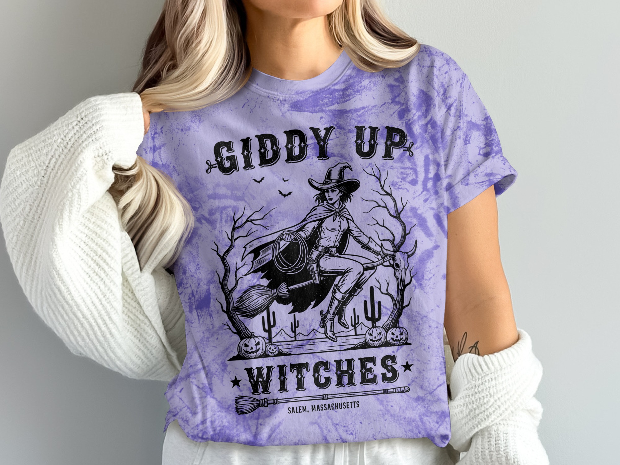 This funny cowgirl witch design is the perfect companion for a sassy girls’ trip to Salem or any festive gathering where western style meets Halloween spirit. Featuring a spirited witch in a cowgirl hat and boots, complete with a broom and lasso, surrounded by desert cacti and pumpkins for a truly one-of-a-kind look.