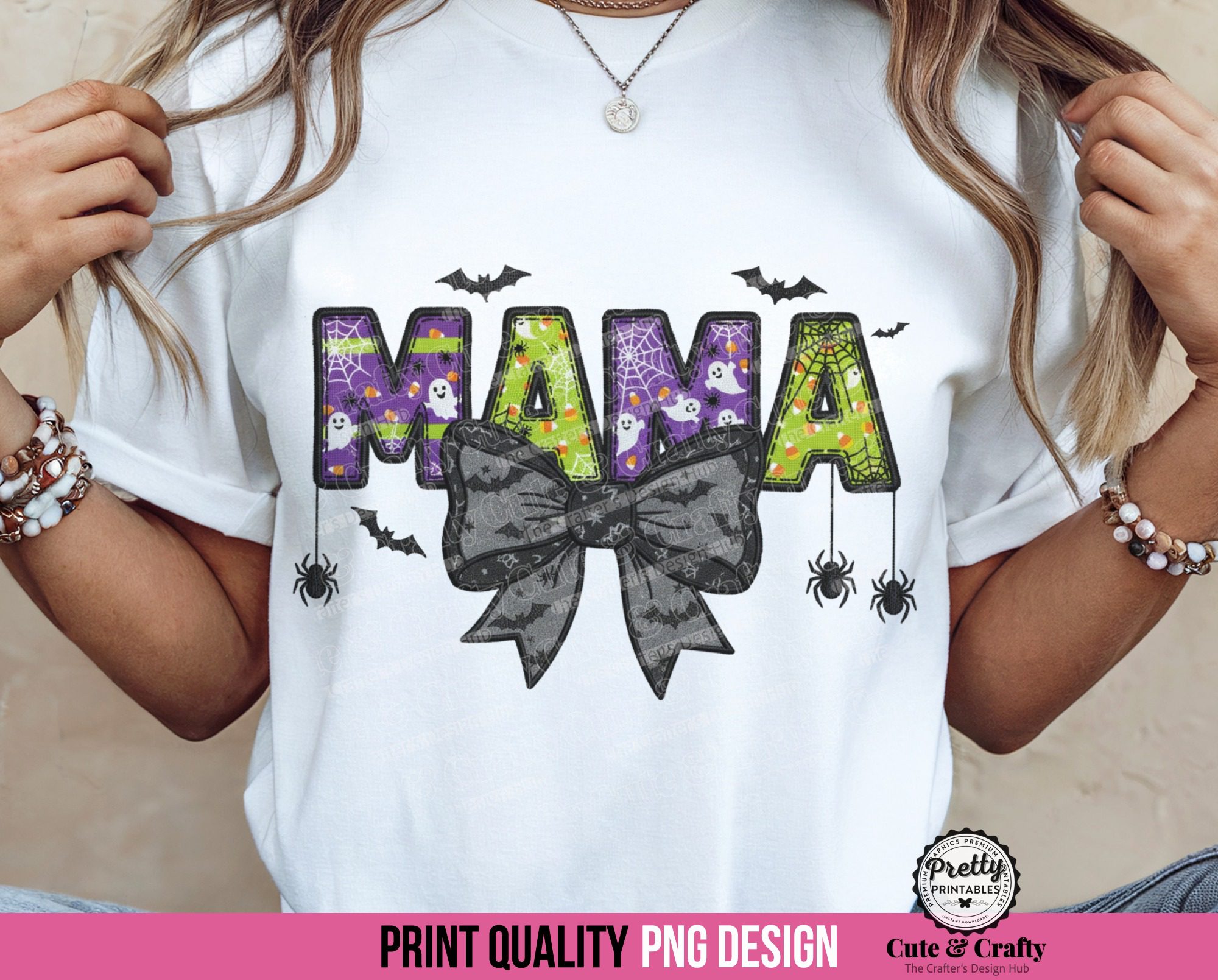 The fun mama doodle letters are filled with classic Halloween patterns like candy corn, spiders, and friendly ghosts. The design is topped off with a trendy black coquette bow and a stunning faux embroidery effect.