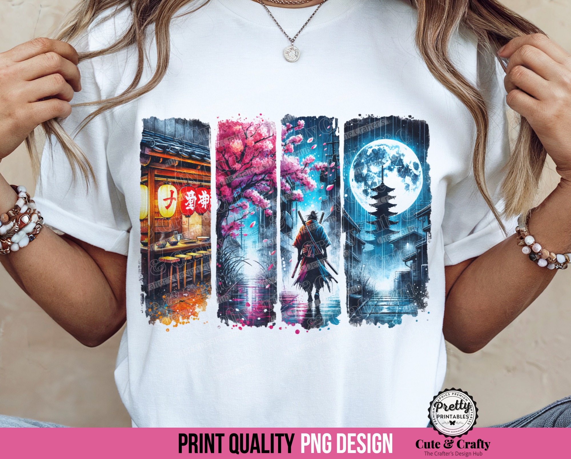 Featuring a captivating ronin samurai, delicate cherry blossoms, a serene pagoda under a glowing moon, and vibrant Japanese street art, this design perfectly captures the elegance and mystique of Japanese aesthetics.