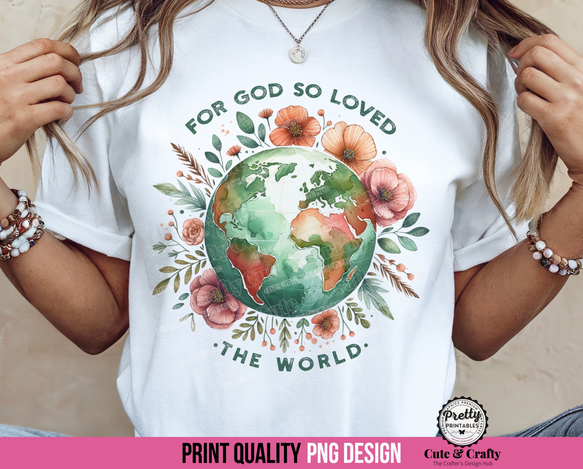 Featuring the timeless scripture John 3:16, “For God So Loved the World,” gracefully surrounding a watercolor Earth adorned with delicate wildflowers, this PNG is perfect for creating inspiring ministry shirts or personal items.