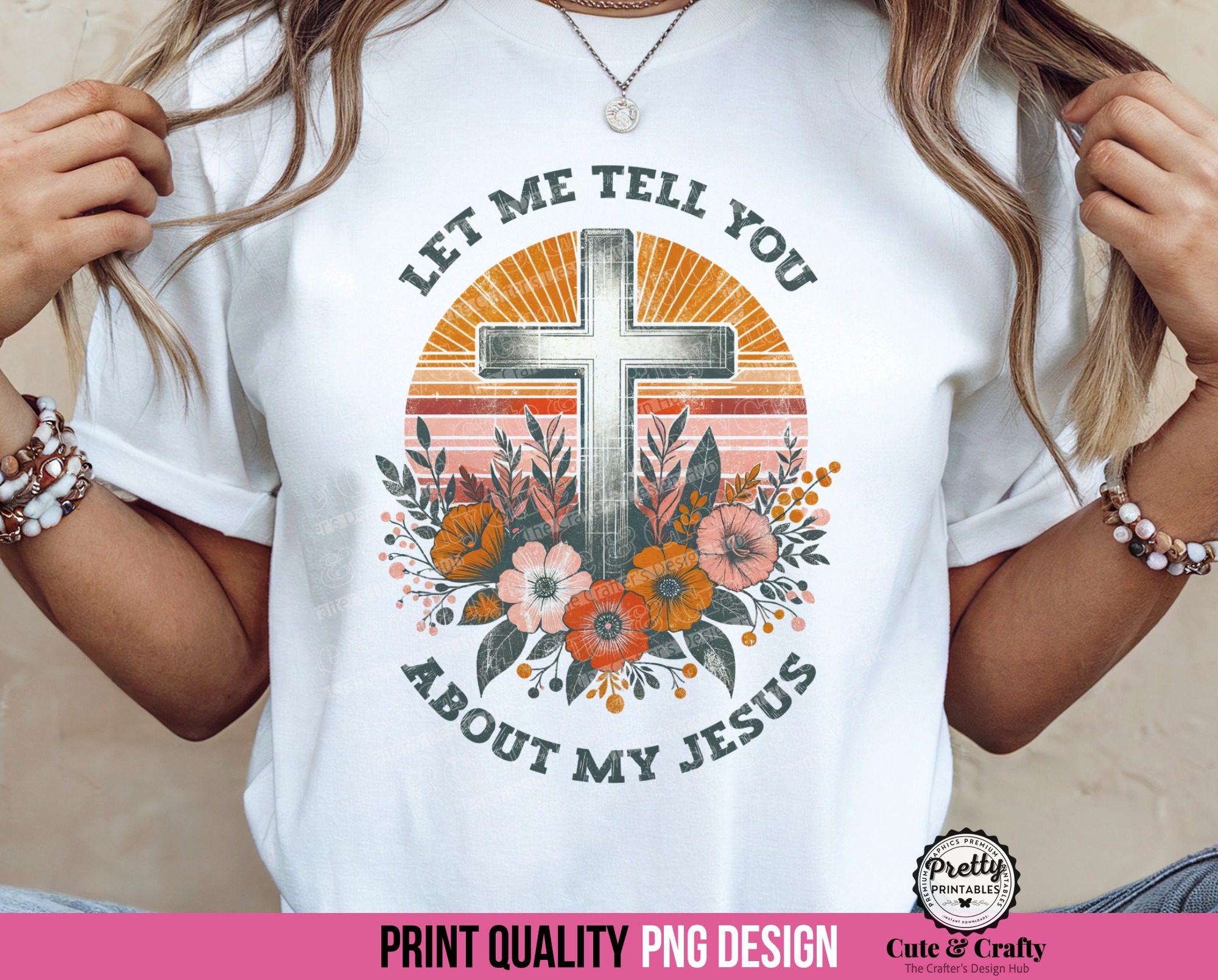 Celebrate your love for Jesus with this “Let Me Tell You About My Jesus” PNG sublimation design! Featuring a boho retro vibe with a cross and wildflowers, this high-quality file is perfect for creating shirts, mugs, stickers, and more.