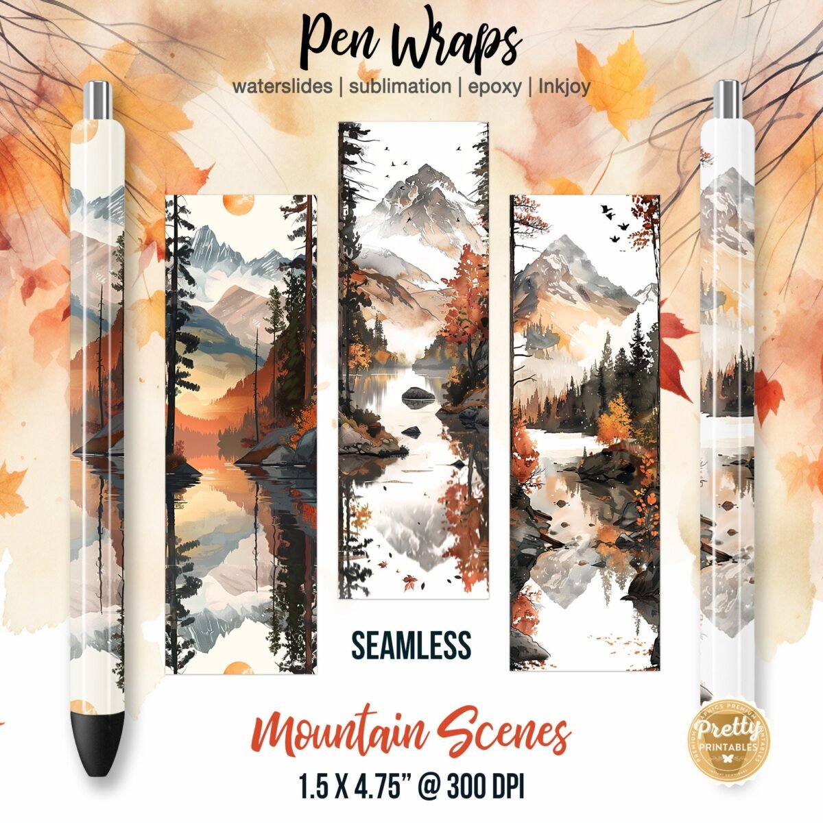Each wrap features a breathtaking mountain scene, complete with reflective streams and autumnal forests, evoking the serenity of a wilderness retreat. The continuous design wraps around your pen, creating an immersive outdoor panorama.