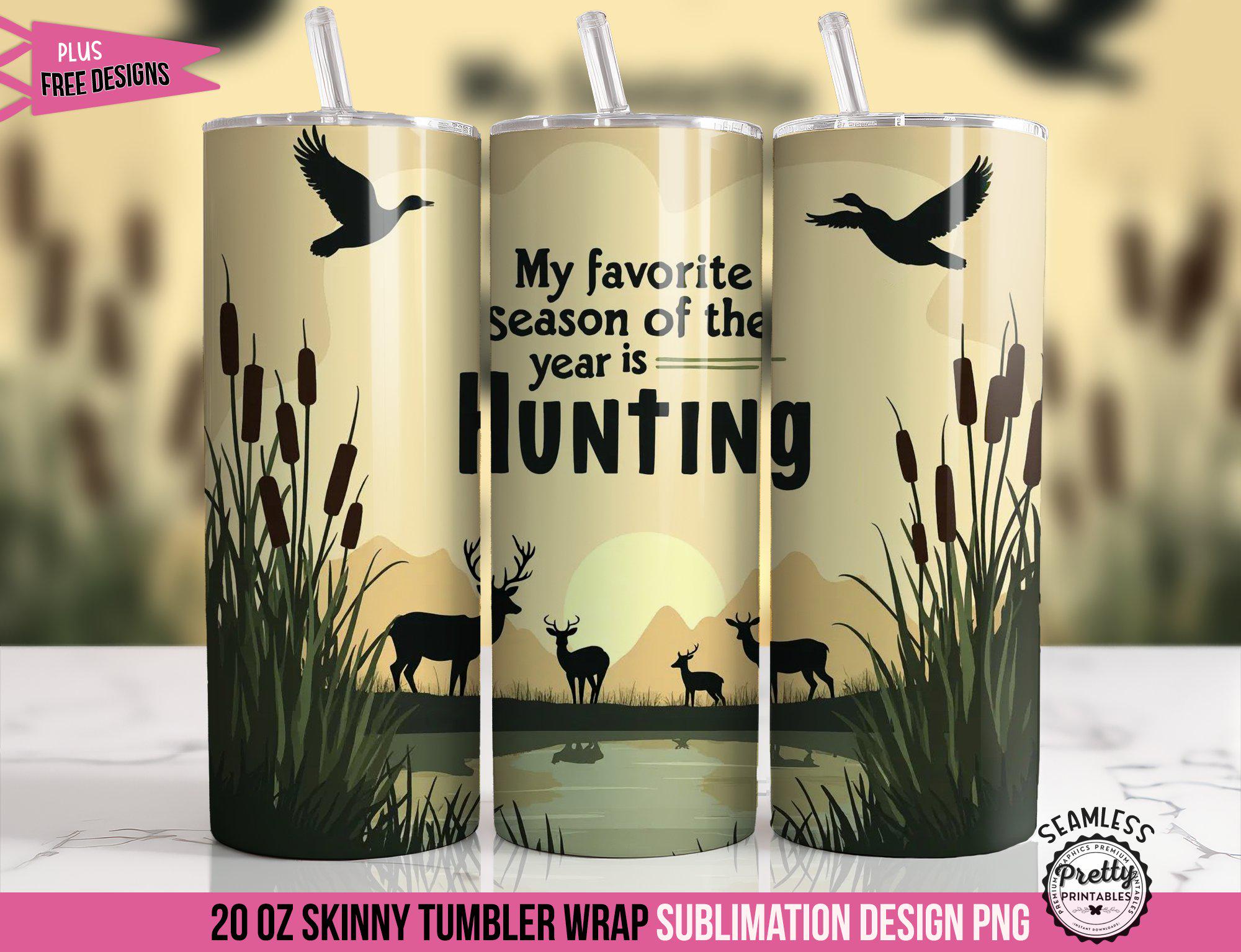 Featuring a stunning seamless sublimation design, this PNG wrap screams “outdoorsman.” The scene captures the essence of hunting season: majestic deer silhouetted against a serene landscape, ducks in flight, and cattails framing a tranquil pond. It’s like holding a slice of nature’s beauty in your hands.