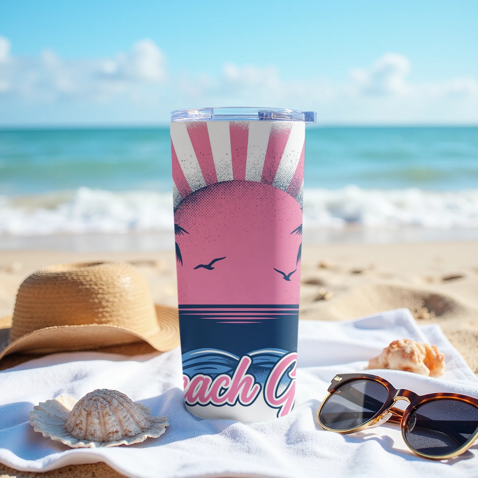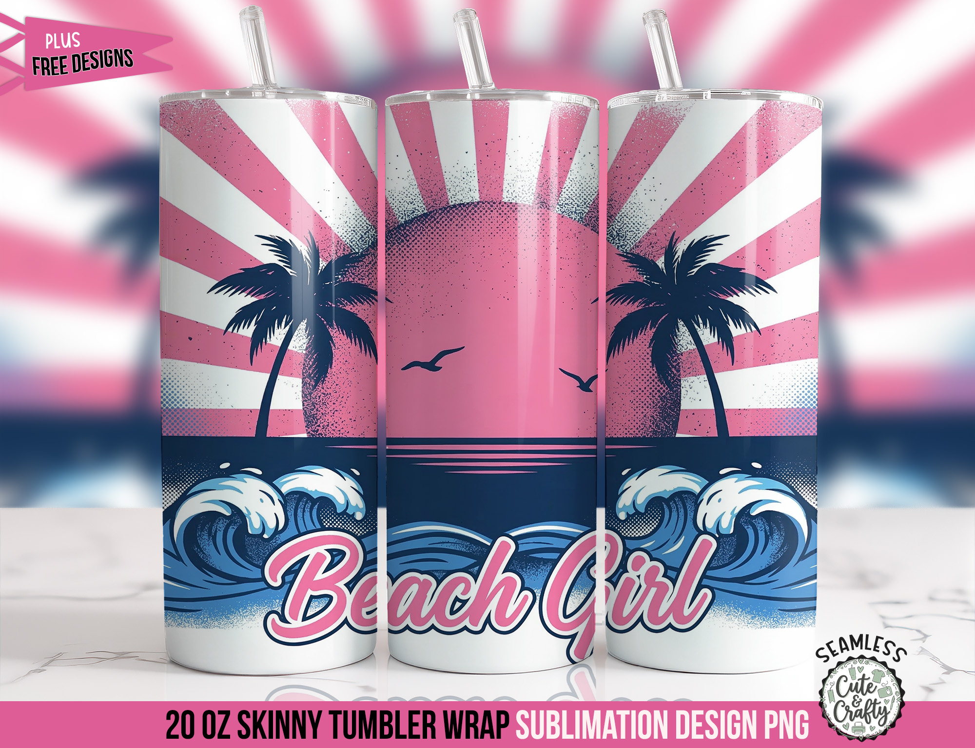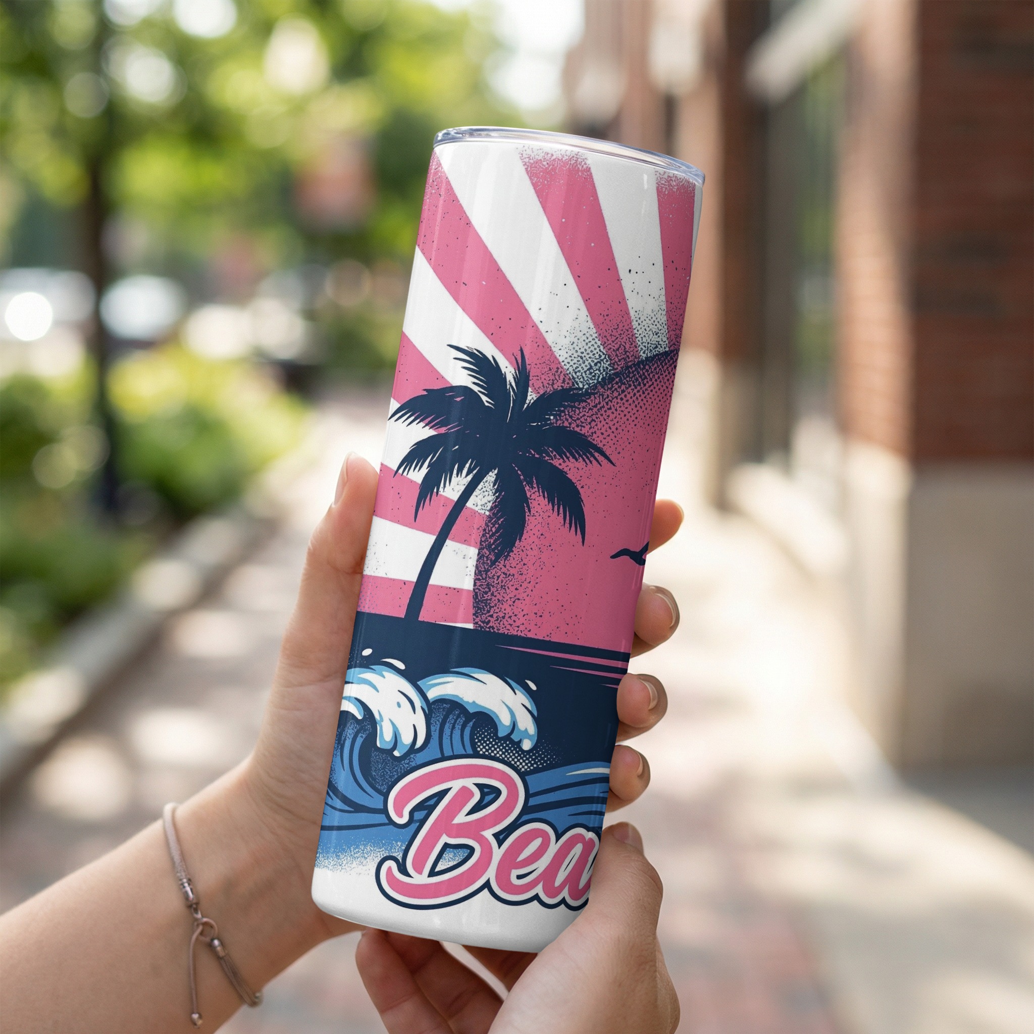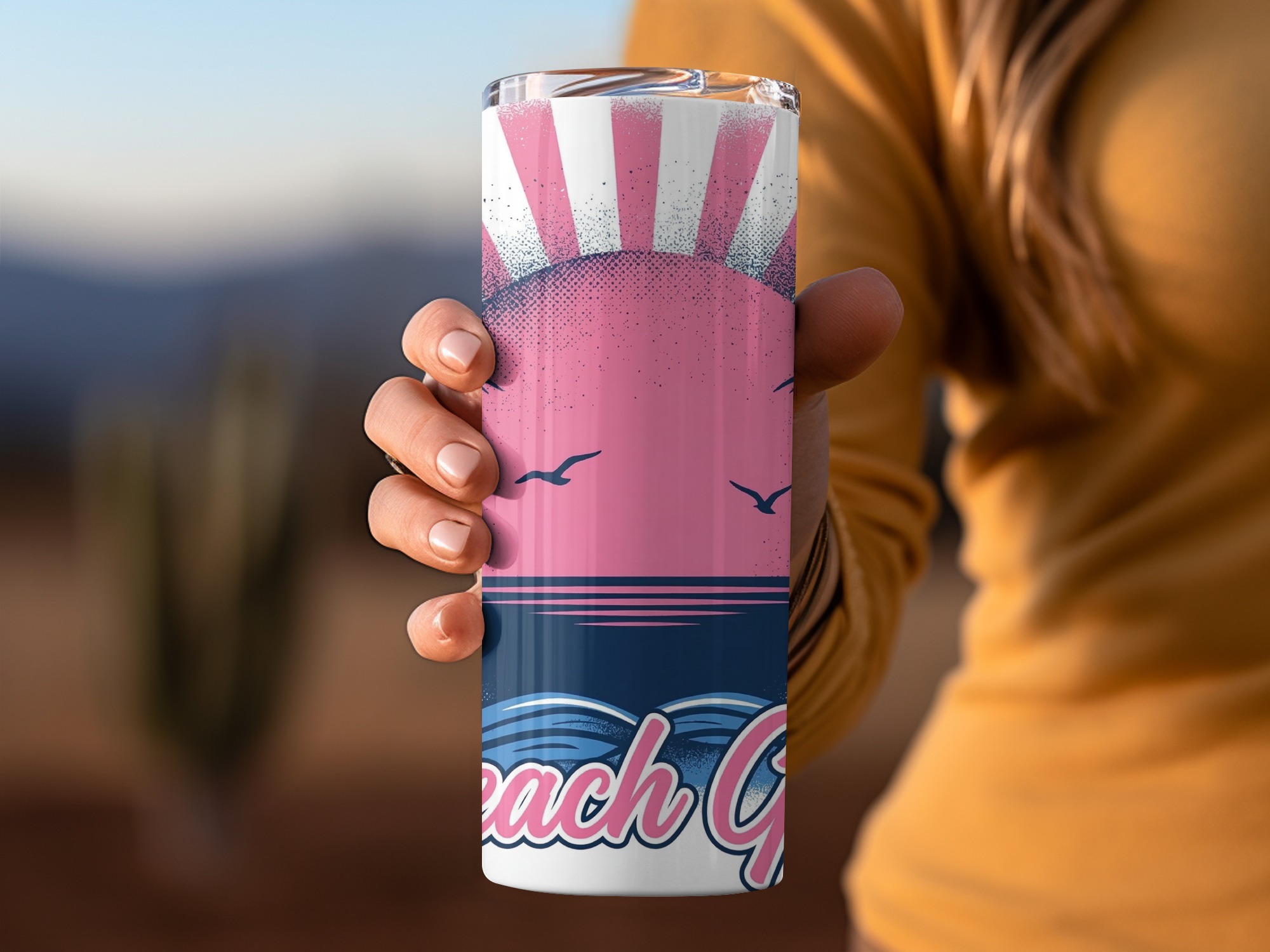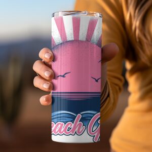This vibrant neon beach girl tumbler wrap PNG adds ultimate coastal energy to your drinkware. It’s a dream for sun-seekers wanting a bold 20 oz summer sublimation design. The layout features a seamless blend of crashing blue waves and swaying palm trees. A glowing pink sunburst radiates pure heat from every angle.