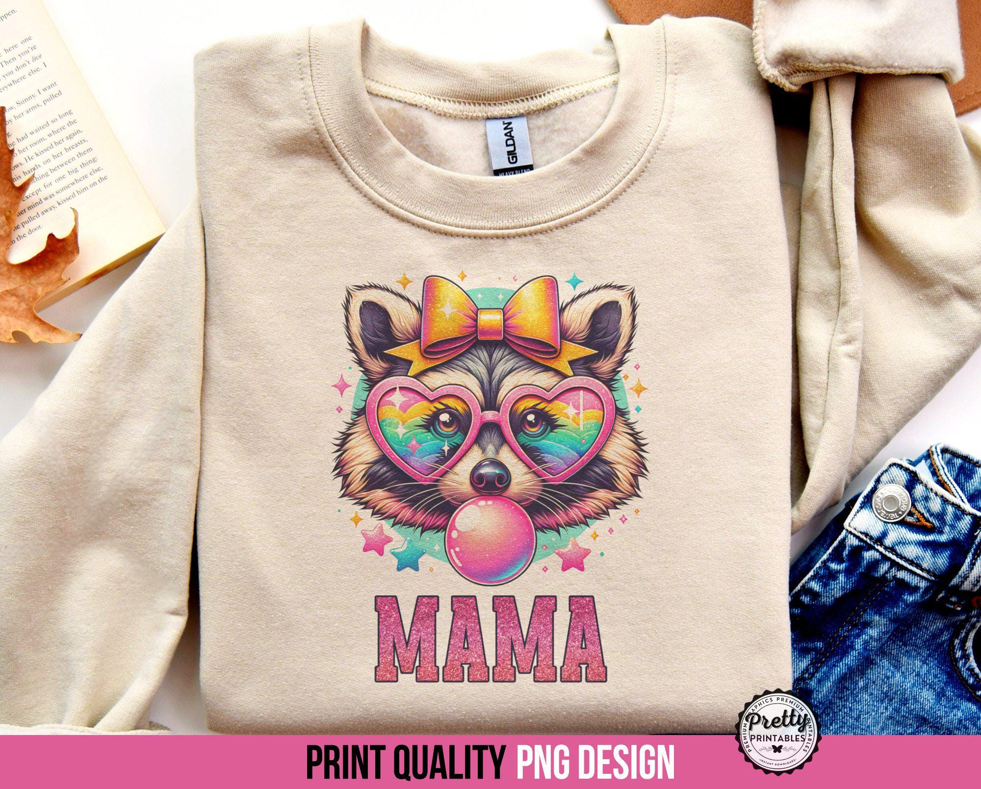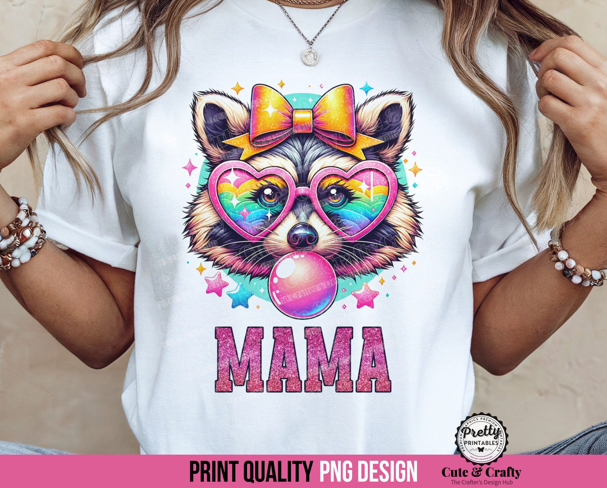 Featuring an adorable raccoon wearing heart-shaped sunglasses, a glittery bow, and blowing a bubble, this sublimation design is perfect for crafting shirts, tote bags, or gifts that celebrate fun-loving moms.