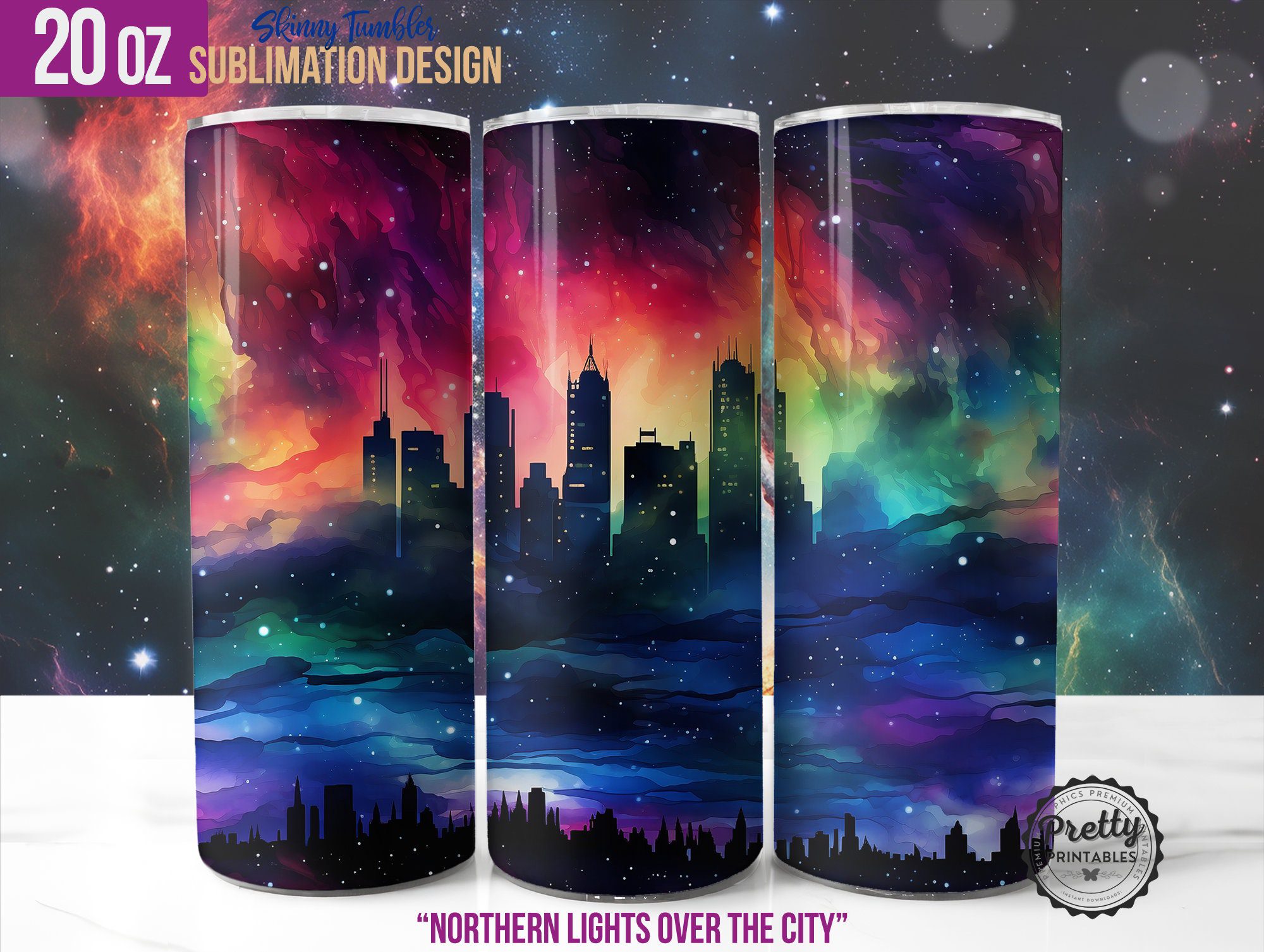 Stand out with an exclusive 20 oz skinny tumbler wrap featuring a vivid city skyline set against a dazzling display of the Northern Lights. It’s perfect for space lovers, city night wanderers, and anyone looking to add a splash of color to their routine.