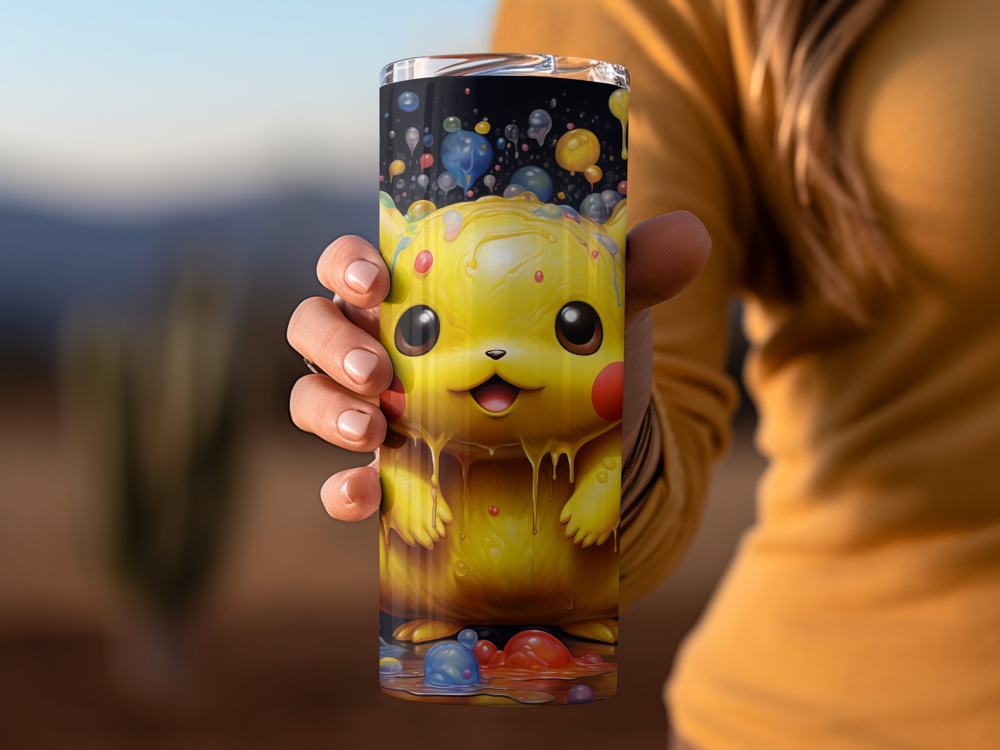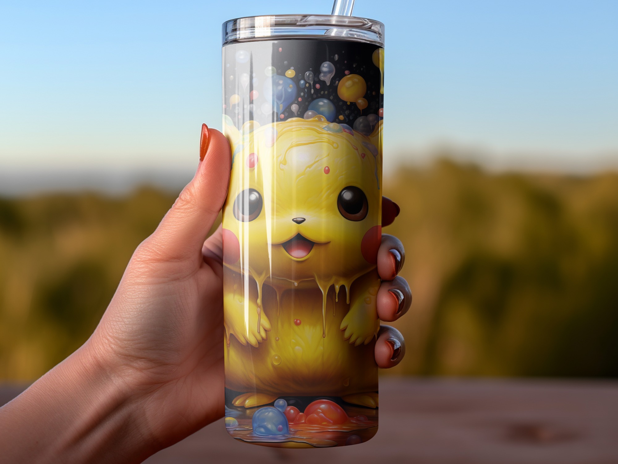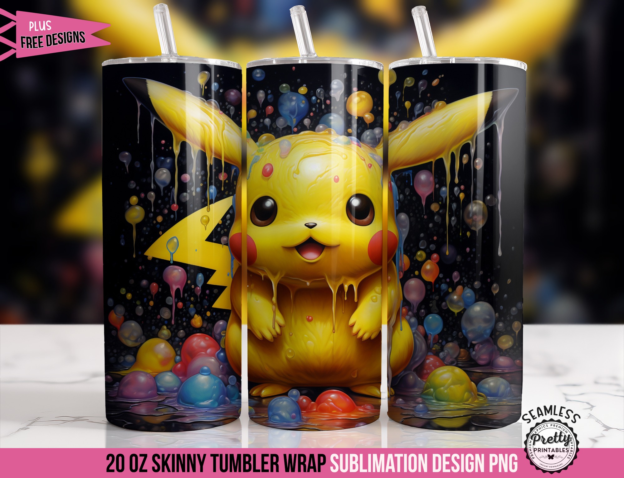 If you’re a serious Pokémon fan or looking for the ultimate gift for one, this is the sublimation wrap you need. Imagine the iconic electric-type looking super sweet, coated in a delightful, drippy “goo” of vibrant, rainbow-colored bubbles and slime against a dramatic black background.