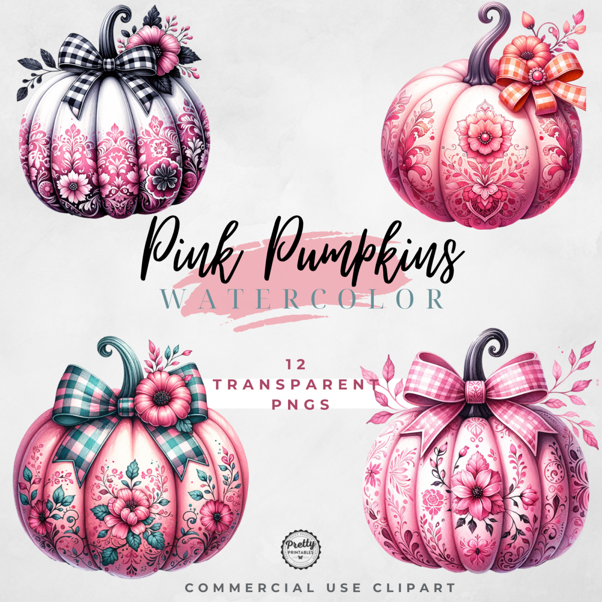 If your creative aesthetic leans toward the charmingly feminine, the intricate, and the irresistibly chic, this is the design pack you’ve been searching for. These watercolor cliparts are a delightful fusion of classic autumn warmth and the trendy coquette style, featuring beautifully detailed pink pumpkins adorned with delicate florals, elegant damask patterns, and stylish gingham and buffalo check bows.