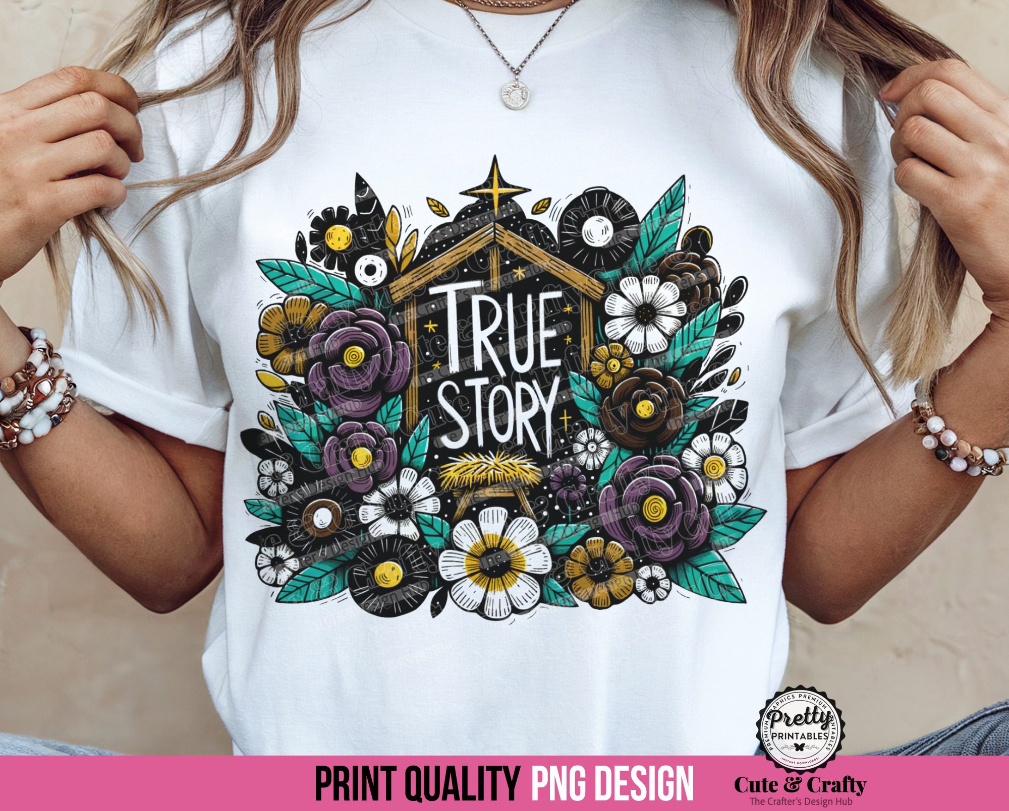 This True Story PNG is the perfect file for your Christian Christmas Shirt Sublimation projects. It features a beautifully illustrated nativity scene nestled inside a trendy, doodle-style flower arrangement. This is not just a typical Nativity png; it’s a vibrant, modern, and joyful way to declare Jesus is the Reason for the season. It’s an ideal design for the Christian Woman who loves a unique, stylish way to share her faith. Get ready to create a gorgeous Jesus Christmas tee that is sure to get compliments!