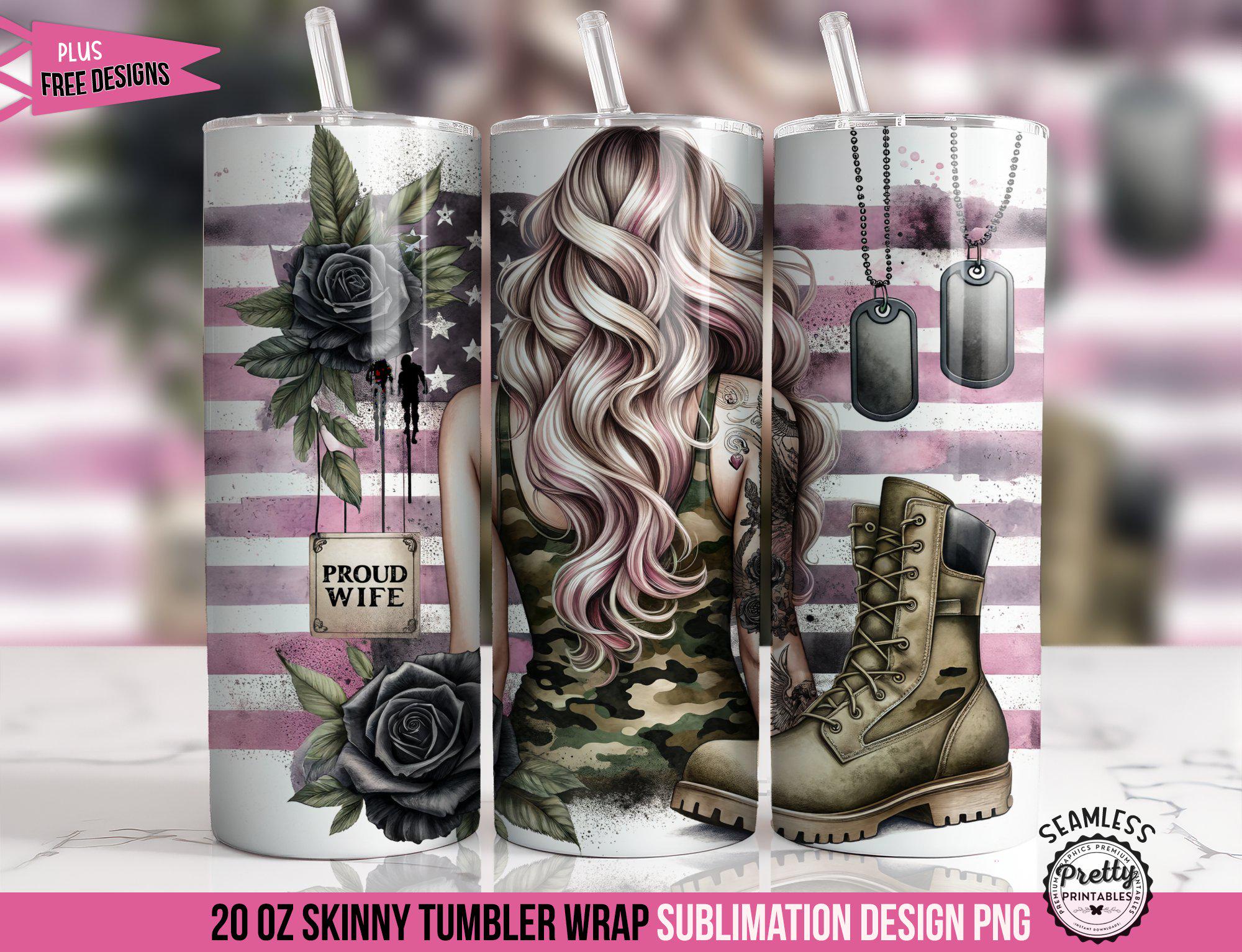 Featuring a military wife with a bold camo pattern, iconic dog tags, and a heartfelt “Proud Wife” emblem, this wrap is a tribute to the resilience and dedication of military families. Ideal for personal use or as a thoughtful gift, this design transforms an ordinary tumbler into a cherished keepsake that resonates with the spirit of military life. Your customers will love how this wrap captures their unique journey and commitment, making it a must-have for any proud military spouse.