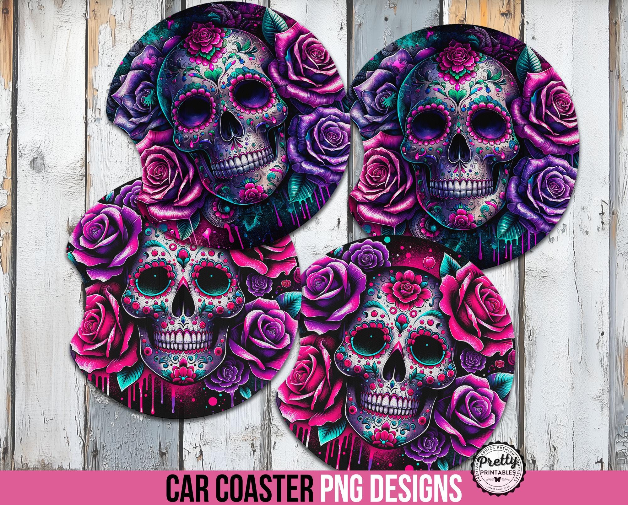 Transform your car’s interior into a bewitching masterpiece with these Sugar Skull Car Coaster Sublimation Design PNGs! Perfect for those who adore a mix of gothic charm and vibrant artistry, these designs are a must-have for anyone looking to add a touch of personality to their car.