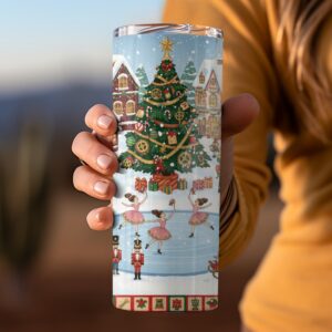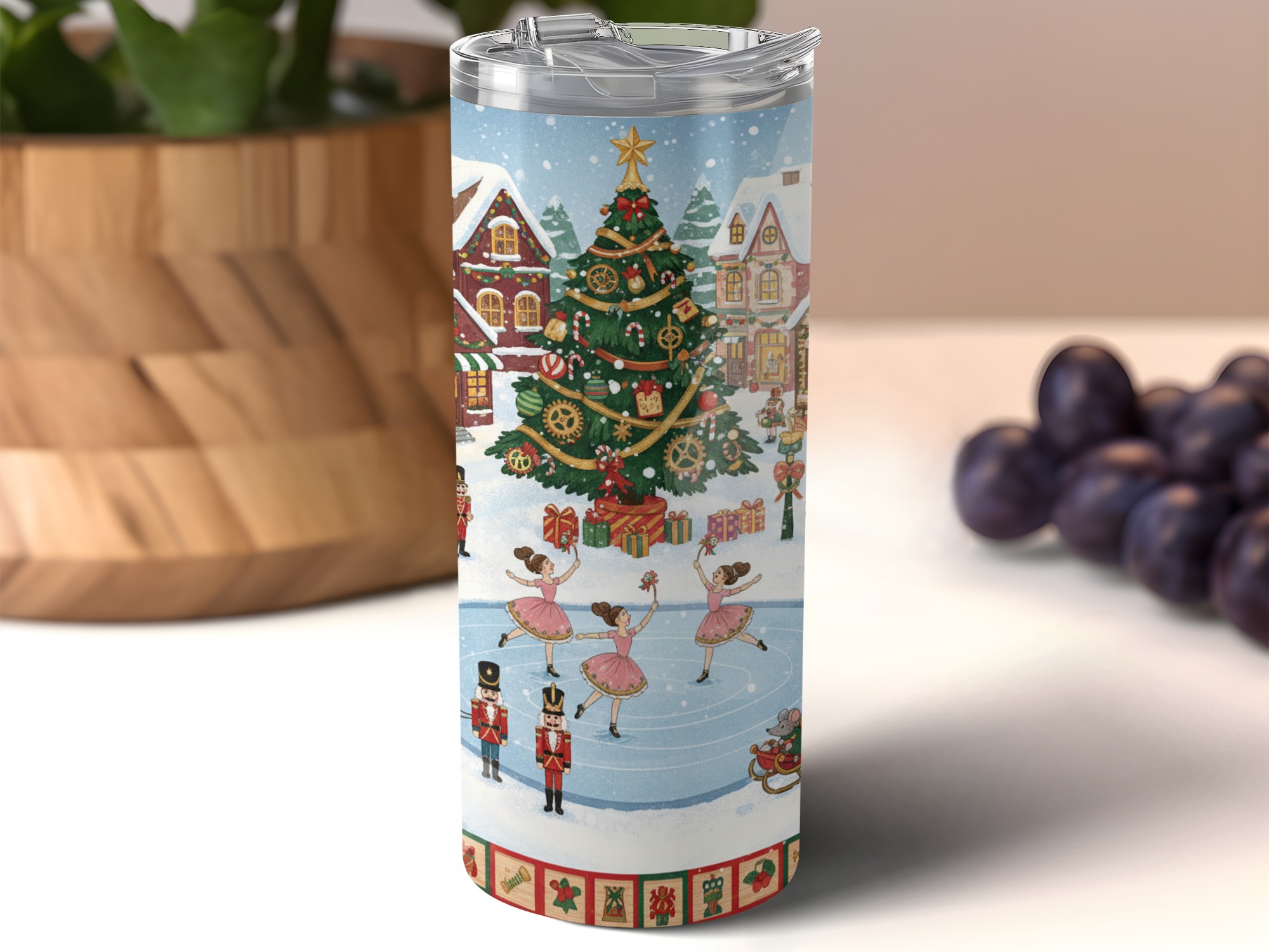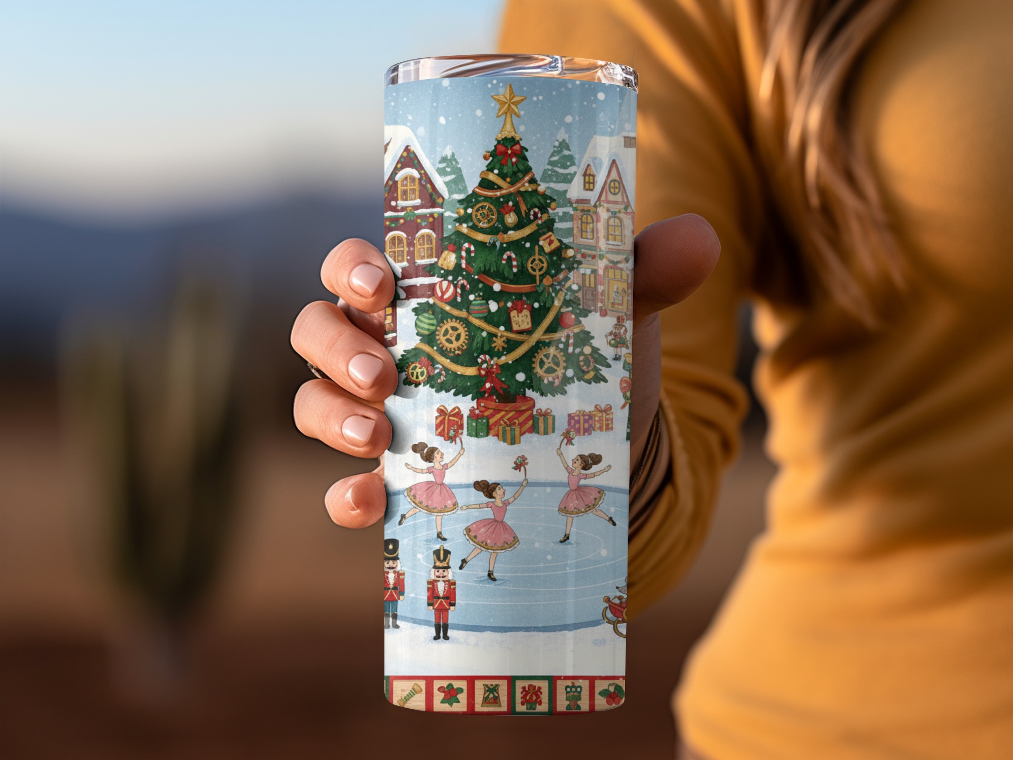 The seamless wrap features an idyllic, snow-covered European village scene centered around an elaborate Christmas tree and a charming ice-skating rink. Ballerinas twirl gracefully alongside stately toy soldiers and cheerful mice, bringing the beloved Nutcracker story to life.