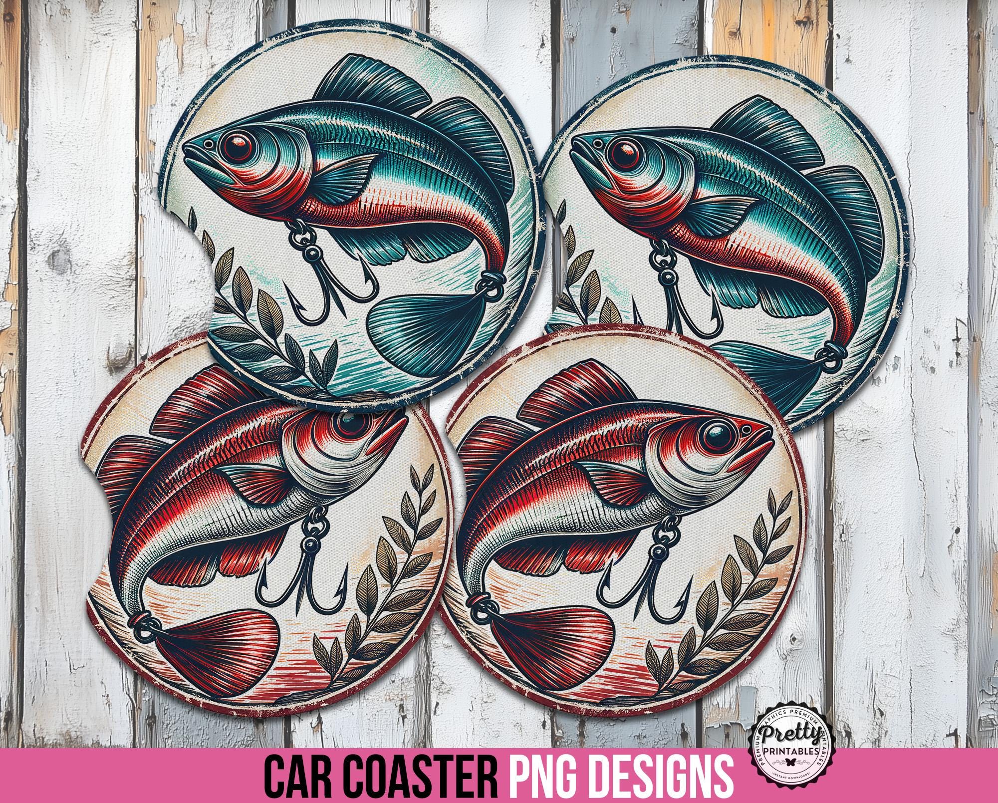 Reel in some retro charm for your ride with the Vintage Fishing Car Coaster PNG Sublimation Set!