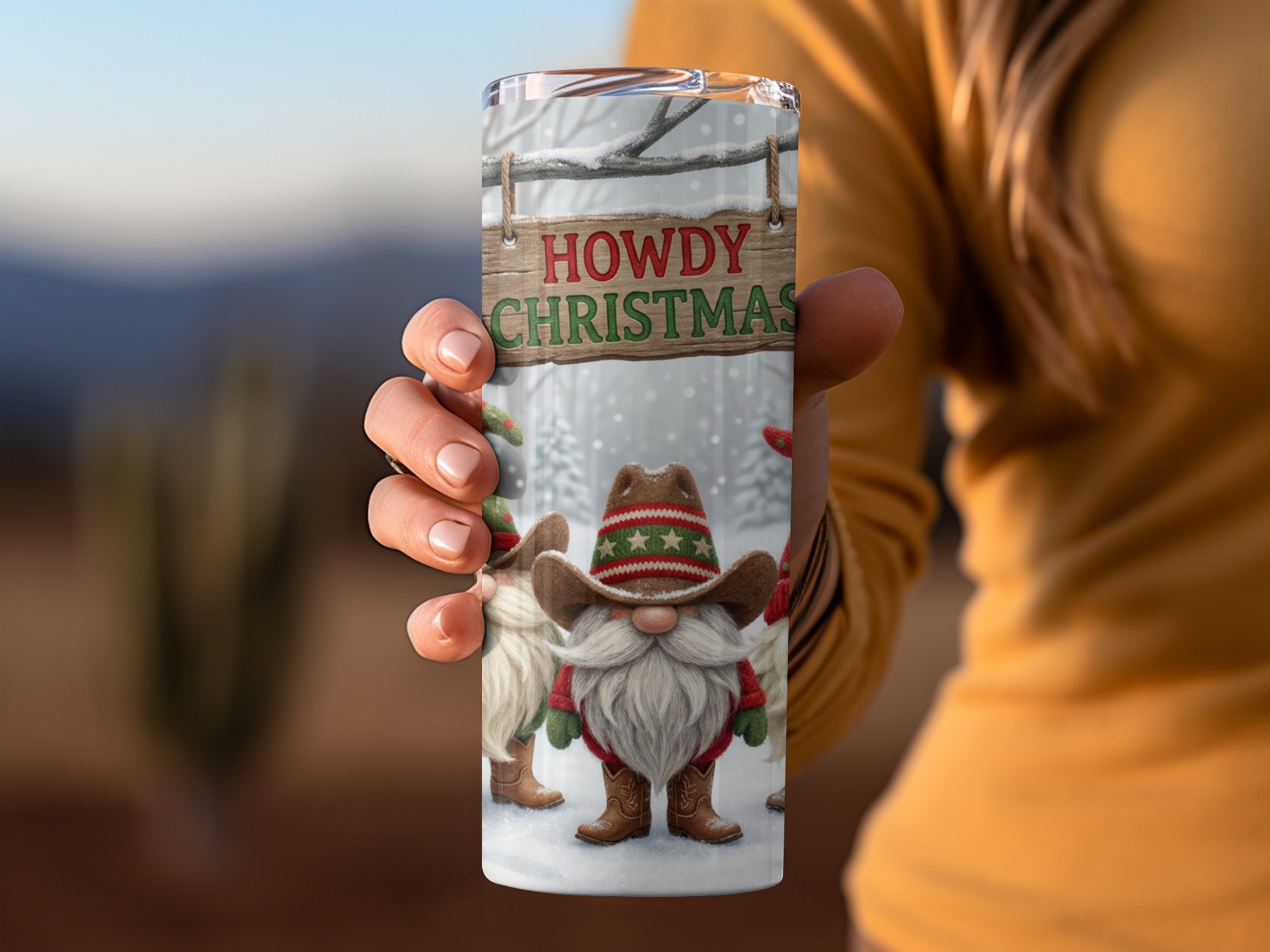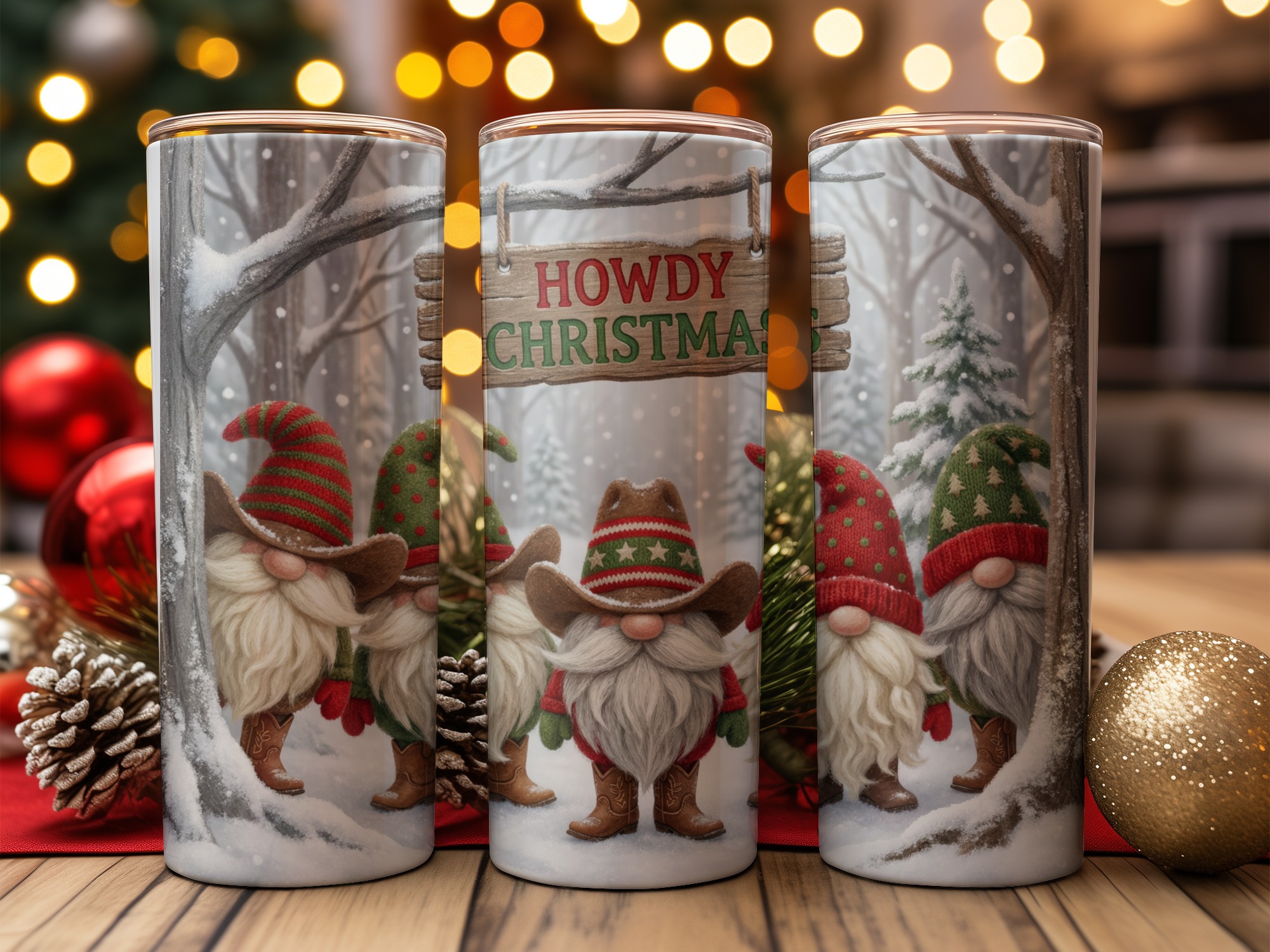 Featuring a group of adorable bearded gnomes dressed in gnome-style cowboy hats and boots, this design blends rustic charm with holiday cheer. The central “Howdy Christmas” sign and the snowy forest backdrop complete the cozy, humorous, and distinctively Cowboy Gnomes theme.